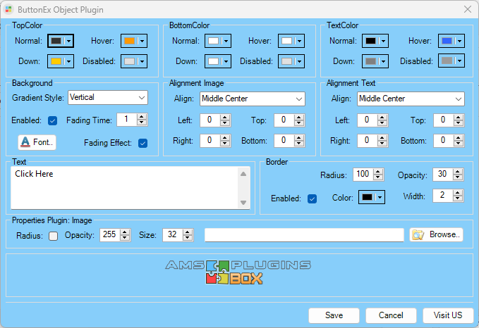 The ButtonEx Object Plugin allows the creation of fully customizable buttons with support for colors, images, gradients, and interactive events like clicks and hover actions. It simplifies the creation of dynamic interfaces in AMS8 and AMS9 projects. Advanced features like SetFromUrl, AddIconEx, AddAssocIcon, and SetImage enhance button design and functionality.