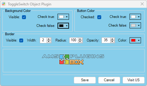 The ToggleSwitch Object Plugin for Autoplay Media Studio (AMS) is an add-on that allows you to create stylized toggle controls within projects developed in AMS. This plugin adds an interactive graphical control that simulates the behavior of a switch, allowing the user to toggle between two states, such as "on" and "off", directly in the application interface.
